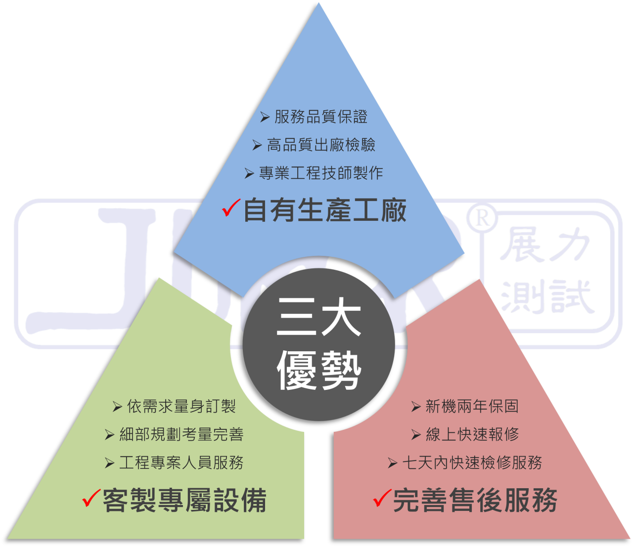 本公司作為專業的設備製造生產工廠,憑藉三大優勢與四項專業核心,提供最優質的可靠度設備服務!從規劃、設計、生產至售後服務為客戶一站式服務,亦可配合客製化製作,因應客戶需求調整設備規劃與設計,使其符合使用上的目標!